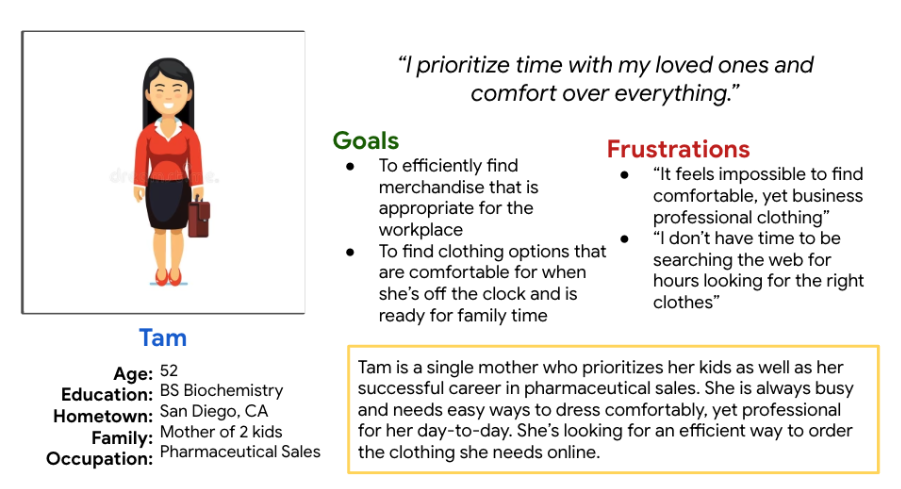 Many people lack the time to shop for clothing due to their busy work schedules and personal lives. It can be difficult to find a specific type of clothing, especially for business-appropriate workwear, in one place. In addition, numerous retail apps are not intuitive and difficult to navigate for users. Our target audience is working adults who identify as female.