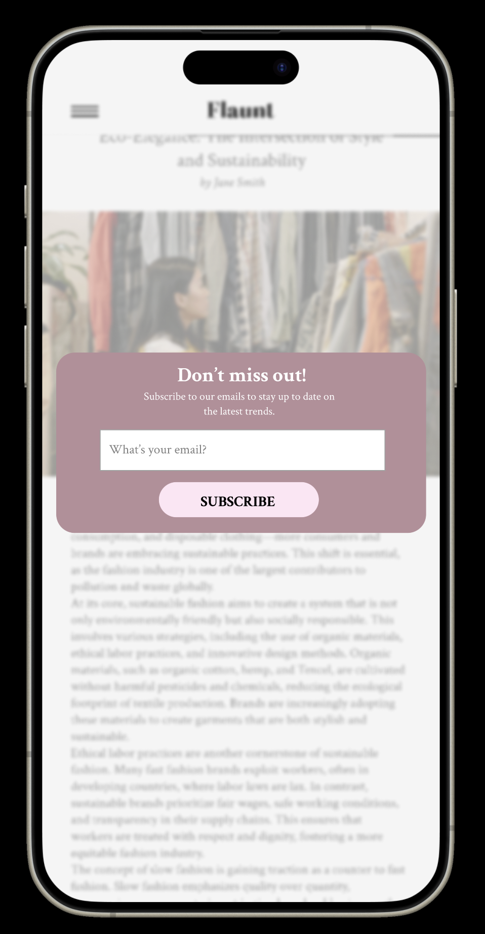 Flaunt Magazine potential email subscription modal. The magazine itself is has a friendly brand identity. The microcopy needs to be concise, yet conversational.